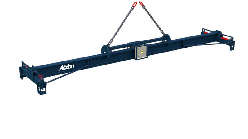 The traverse is a low-cost compromise for all users who do not have a container terminal and want to lift containers with existing crane equipment. Attachment to the upper ISO container corners of the 20″ container. Working widths: 10″, 20″, 40″ standard ISO containers. Crane side with eye suspension, adjustable to load centre of gravity in longitudinal direction by simply moving the crane. Load side with 4 ISO bolts, rotatable 90° for locking.